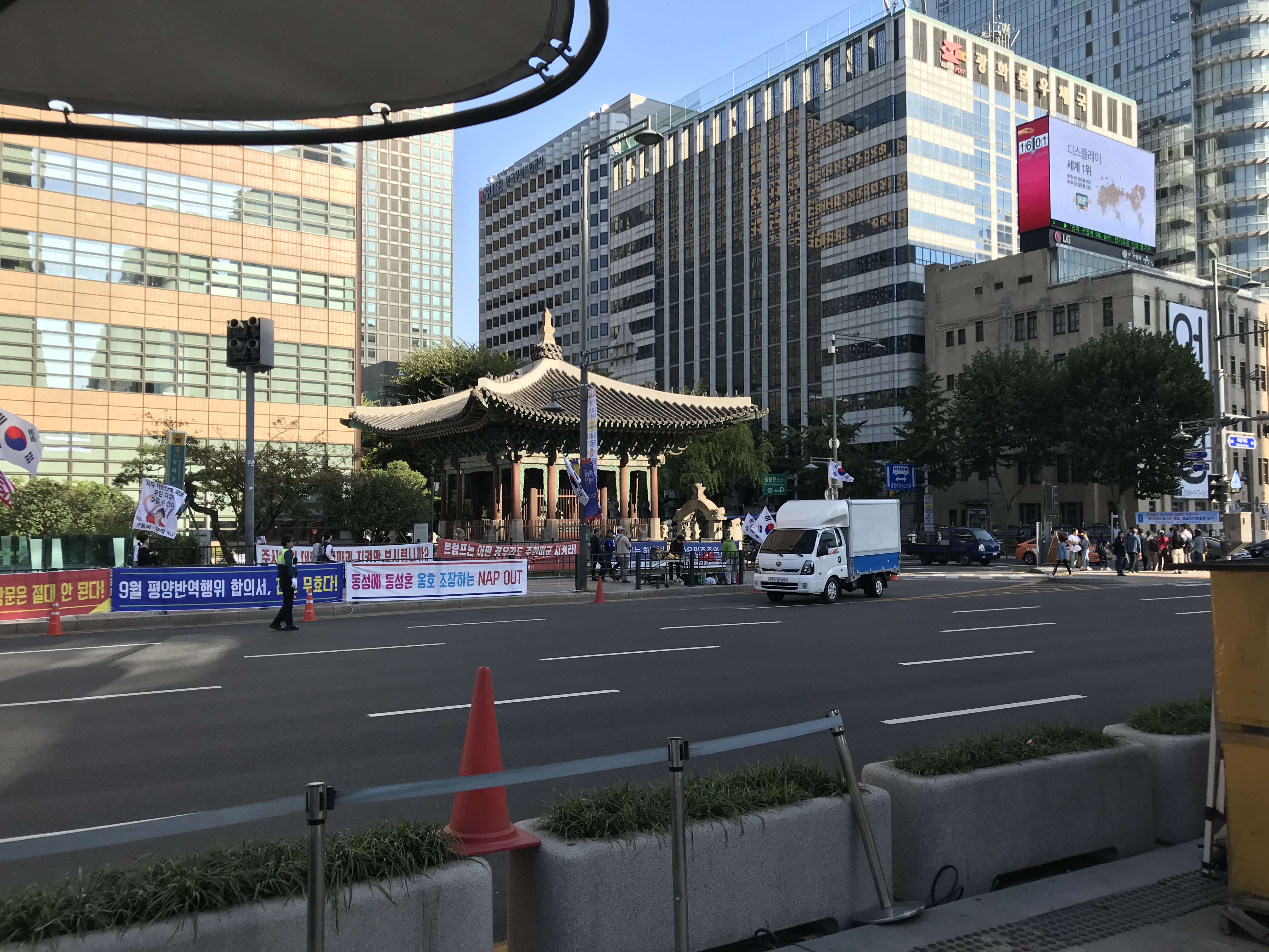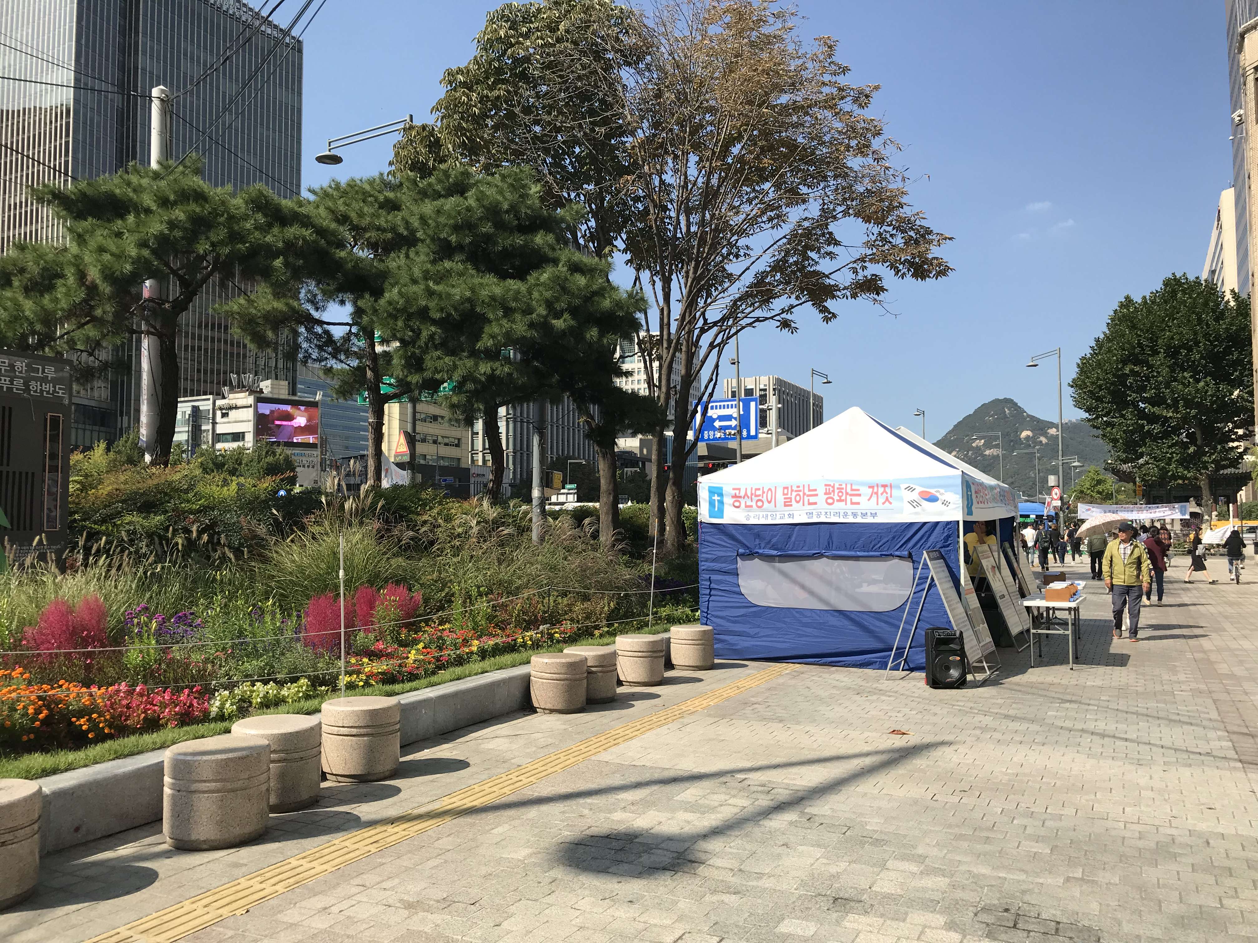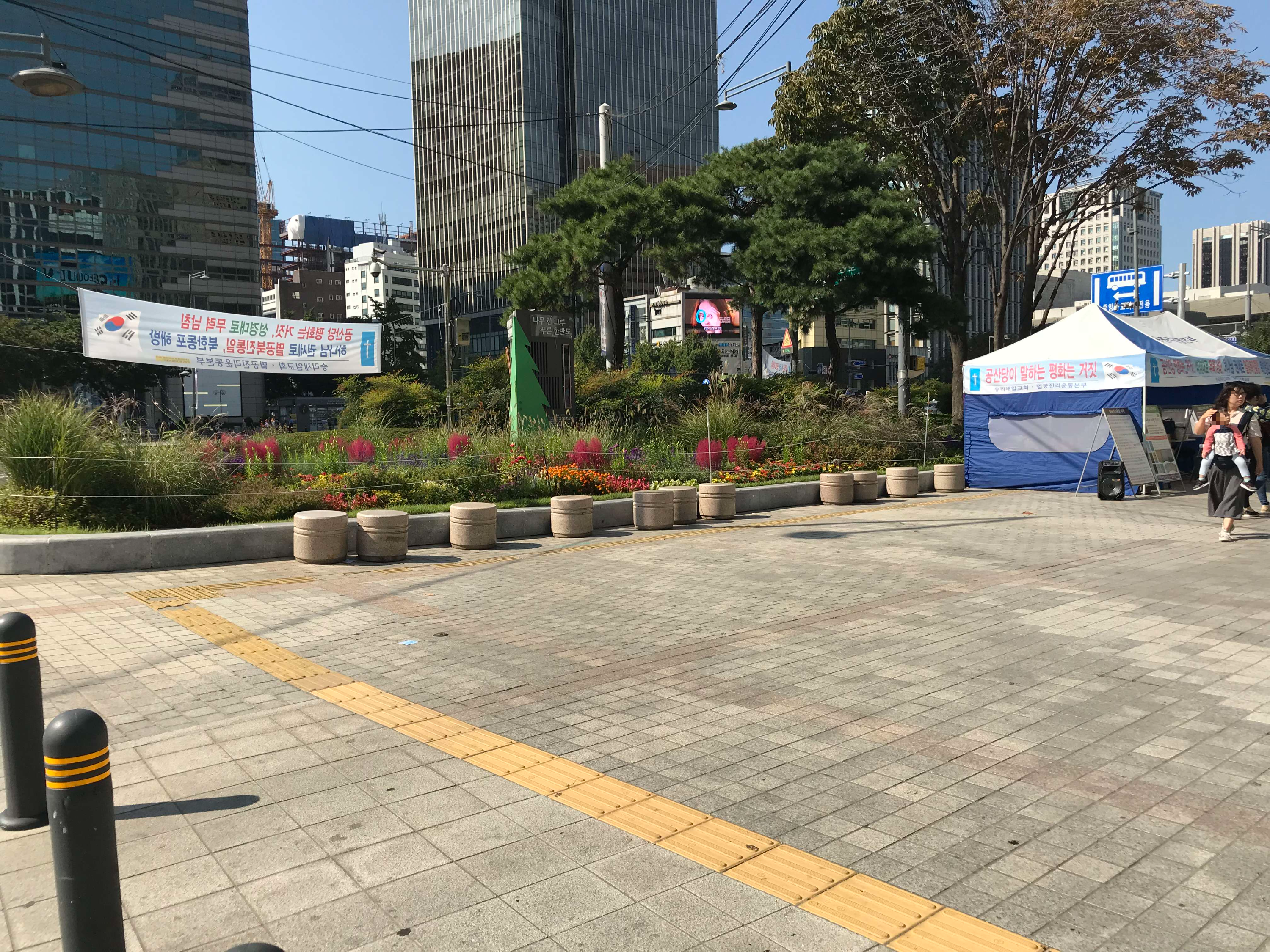 익숙하지만 여전히 적응하기 힘든 글귀들이 적힌 현수막, 천막들. 미래사회가 되었는데, 중세의 신분제가 존재하는 사회로 그려지는 SF영화를 보는 느낌.