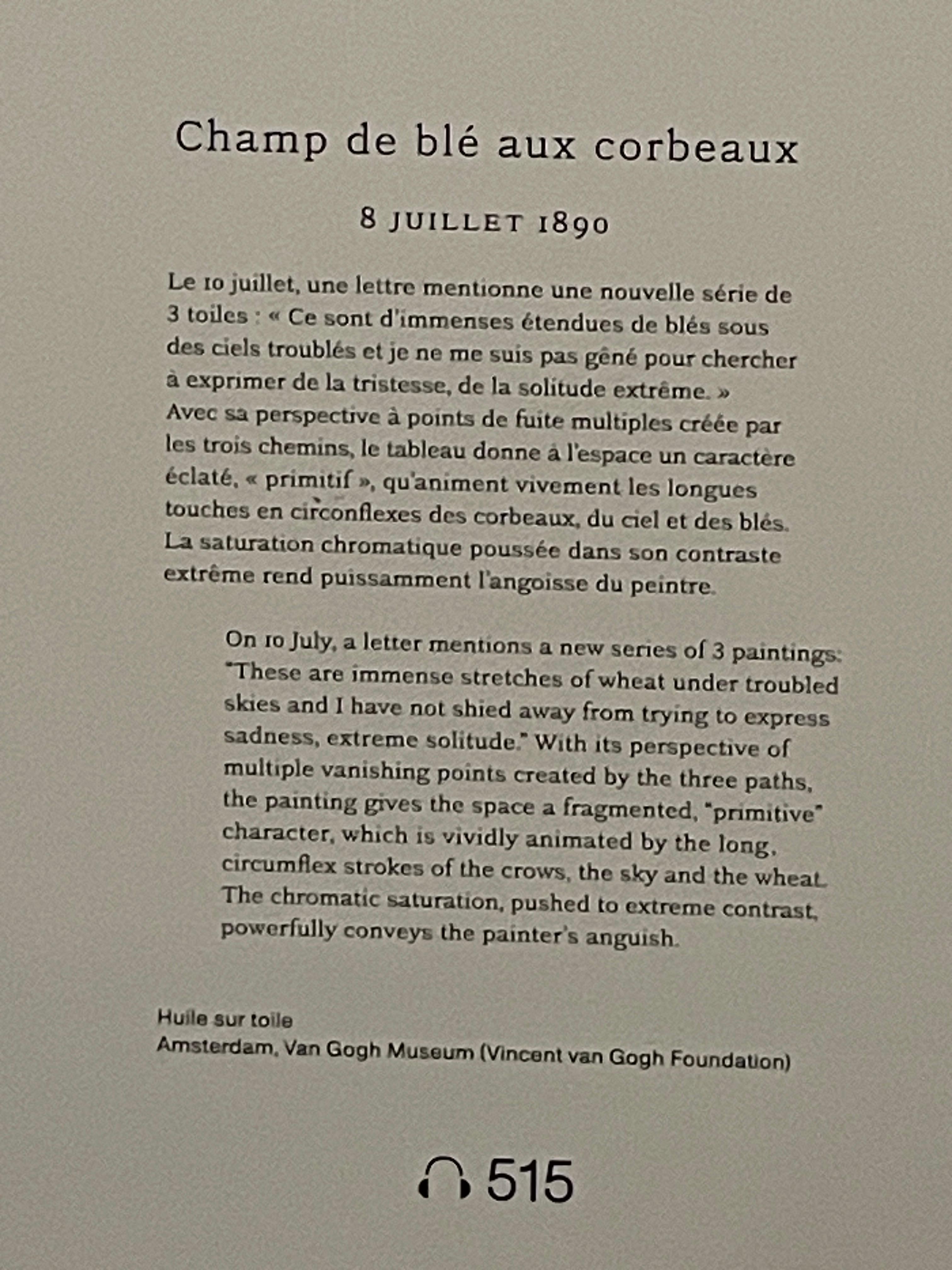 세 갈래 길에 의해 형성된 다중 소실점 원근법은 이 그림의 공간에 분열적이고 '원시적인' 특성을 부여하며, 까마귀와 하늘, 그리고 밀밭을 묘사한 긴 꺾쇠(^) 모양의 붓터치가 이를 생생하게 움직이게 합니다.