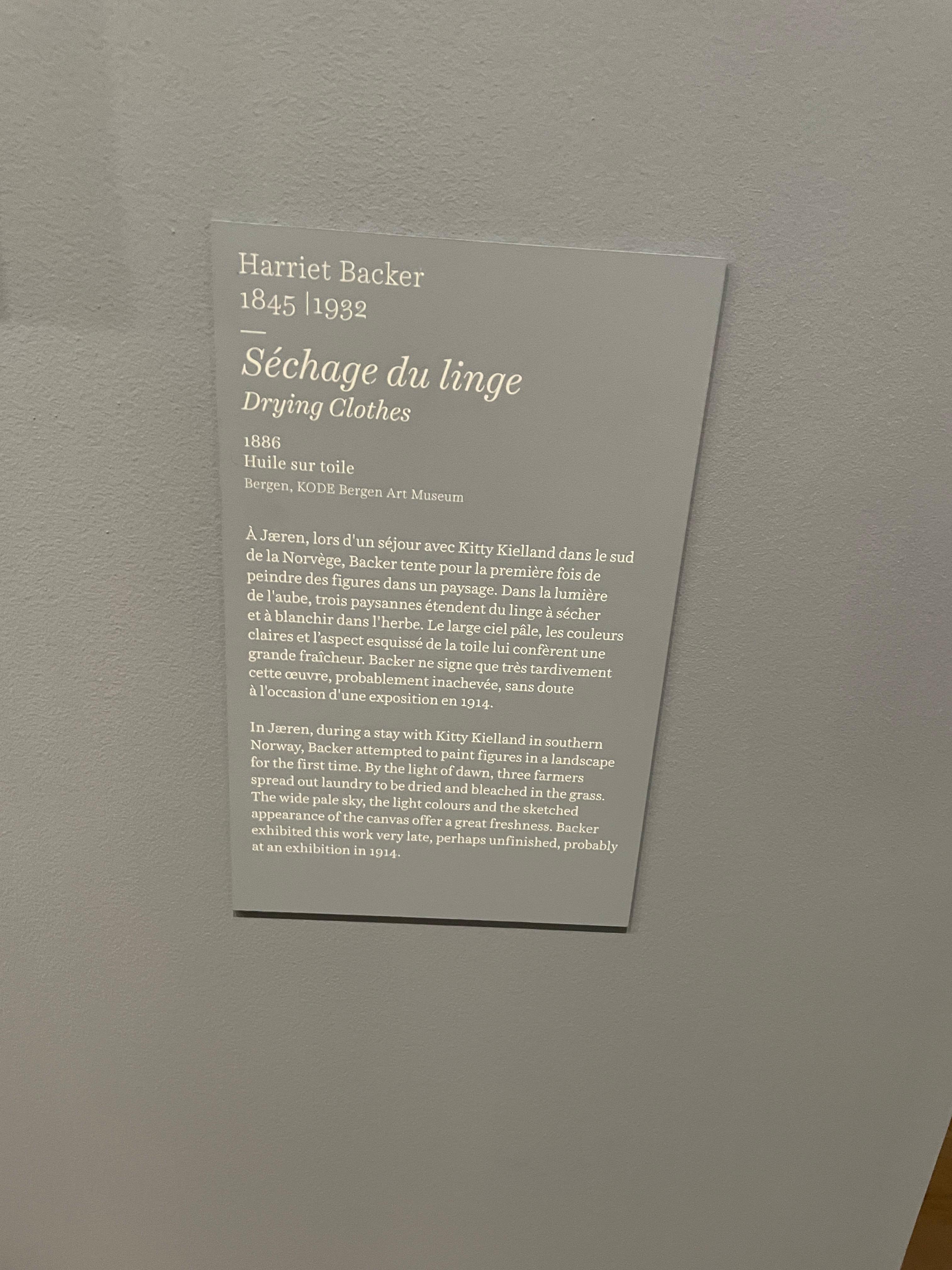 "자국의 경계를 넘어서는 비교적 잘 알려지지 않았지만, 노르웨이 화가 하리에트 바케르는 19세기 말 노르웨이에서 가장 명망 높은 여성 화가였다. 풍부하고 밝은 색채 사용으로 유명한 그녀는 실내 장면과 야외 회화를 결합한 매우 개인적인 회화적 종합을 이루어냈다.