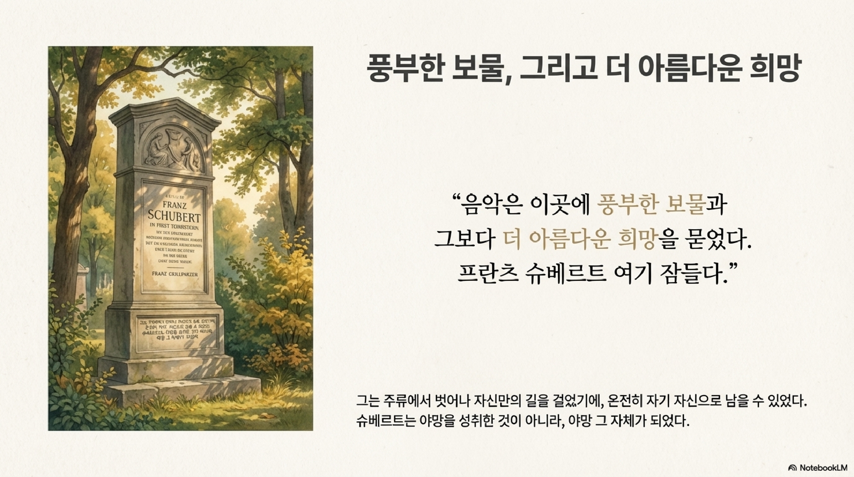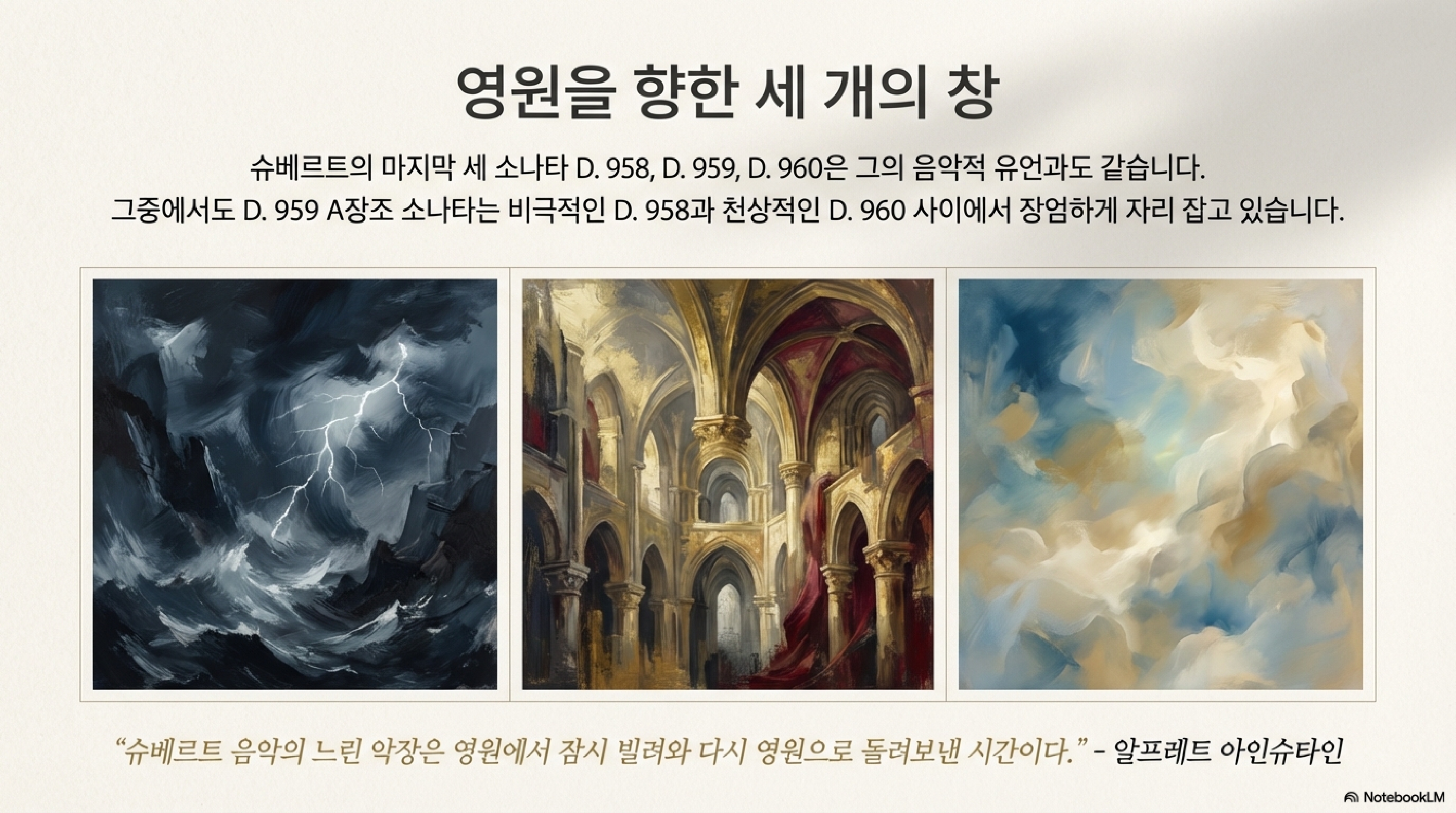 다음은 유튜브 채널 Wind Art Mind에 올린 NotebookLM이 생성한 영상 « 슈베르트의 마지막 소나타 : 천재가 남겨준 보물 »입니다.
