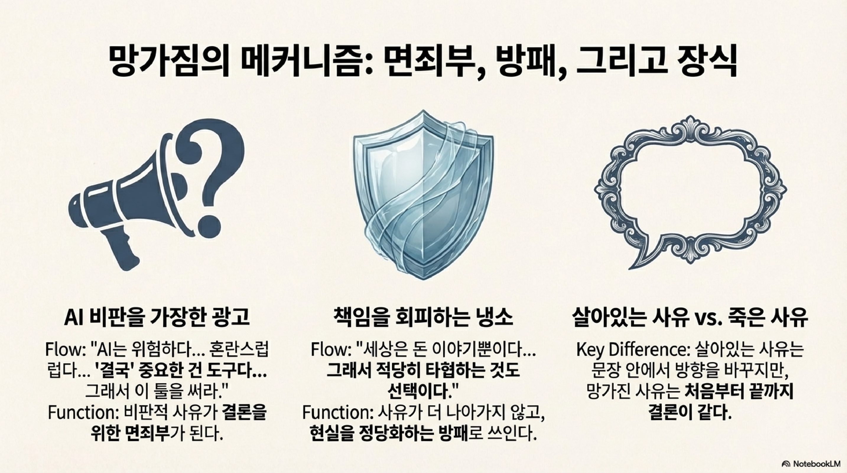 - 'AI 비판을 가장한 광고형 언어' 이 유형은 비판적 문제 제기를 특정 제품이나 서비스의 광고로 강제 연결하는 구조를 폭로한다. "AI는 창작의 의미를 흔들고 있다"는 심오한 질문을 던진 뒤, 그 문제의 깊이를 파고드는 대신 '결국', '그래서'와 같은 접속사를 사용하여 논증 과정을 생략하고 "중요한 건 도구를 어떻게 쓰느냐이다. 그래서 이 툴을 활용하면..."이라는 결론으로 직행한다. 사유의 언어는 문제의 본질을 가리고 특정 해결책을 정당화하는 '면죄부'이자 '알리바이'로 기능한다.