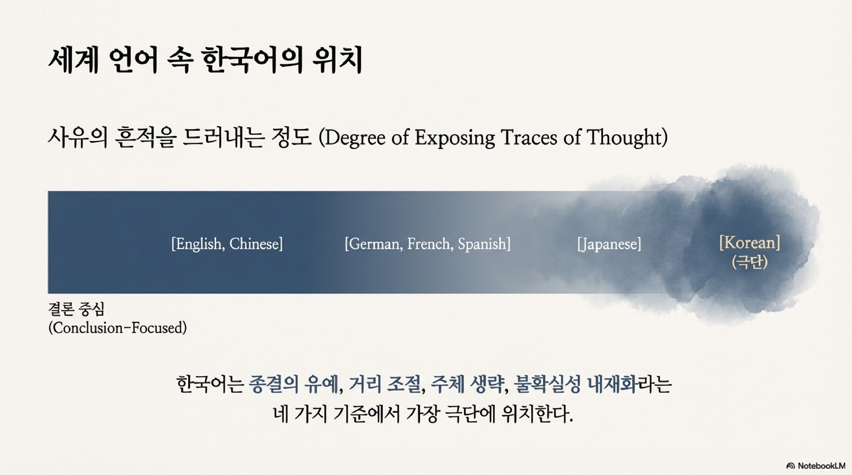 이러한 세 가지 구조적 특징들이 결합되면서, 한국어는 젊고 공격적인 확신에 찬 주장보다, 경험 이후의 '피로, 체념, 관조, 거리 두기'와 같은 복합적이고 성숙한 '어른의 정서'를 담아내는 데 탁월한 언어가 된다. 그렇다면 이러한 한국어의 특수성은 다른 언어들과 비교했을 때 어떤 위치에 놓이는가? 다음 장에서는 비교 언어학적 관점을 통해 이를 더욱 명확히 조명해볼 것이다.
