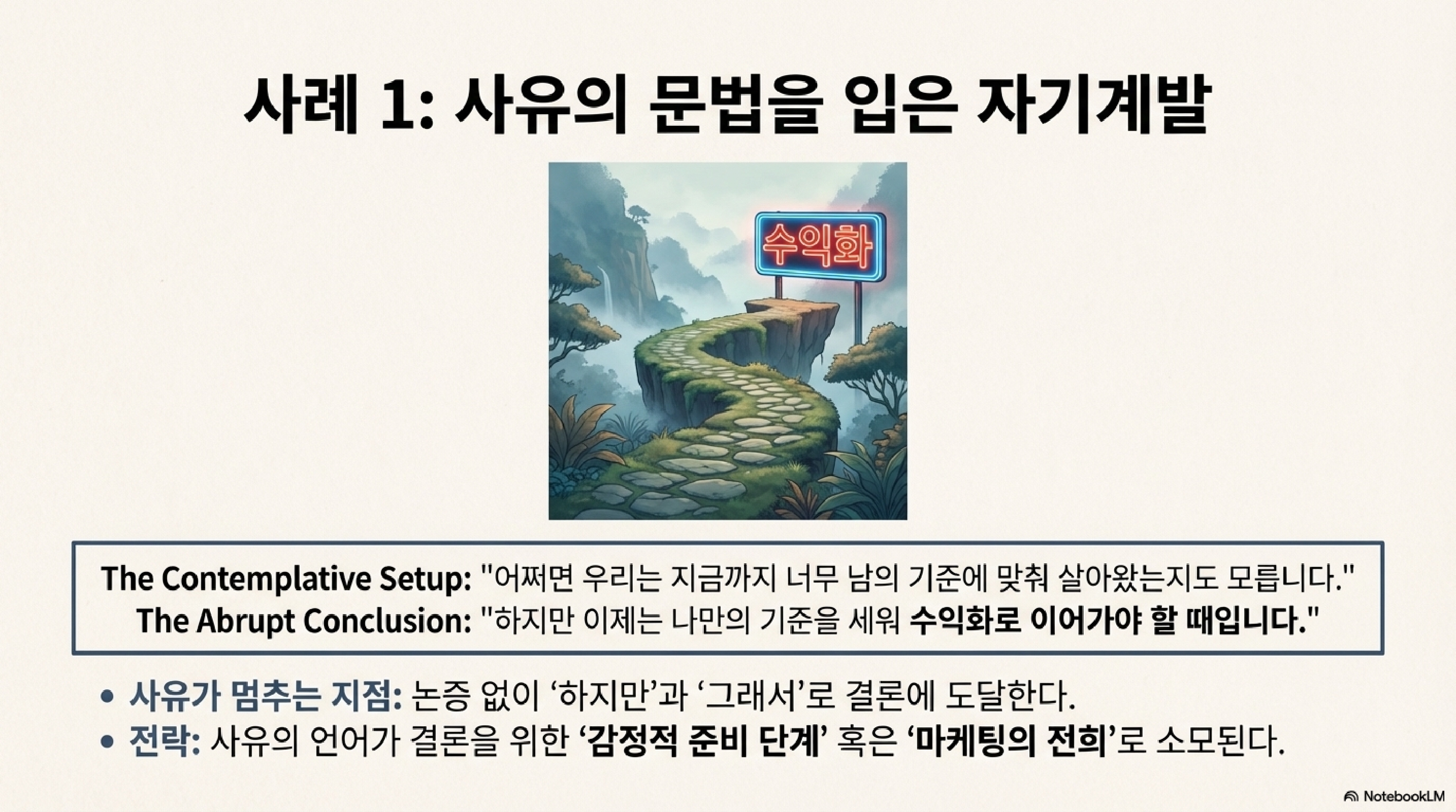 - '사유형 자기계발 언어' 이는 사유의 언어를 특정 결론, 주로 수익화나 성공과 같은 자기계발적 목표를 위한 도구로 소모하는 형태다. "어쩌면 우리는 지금까지 너무 남의 기준에 맞춰 살아왔는지도 모릅니다"와 같이 사유적인 문제 제기로 시작하지만, 논증 과정 없이 "이제는 나만의 기준을 세워 수익화로 이어가야 할 때입니다"라는 즉각적인 행동 지침으로 비약한다. 여기서 사유는 진정한 탐구 과정이 아니라, 결론을 팔기 위한 '감정적 준비 단계' 또는 '마케팅 전희'로 전락하고 만다.