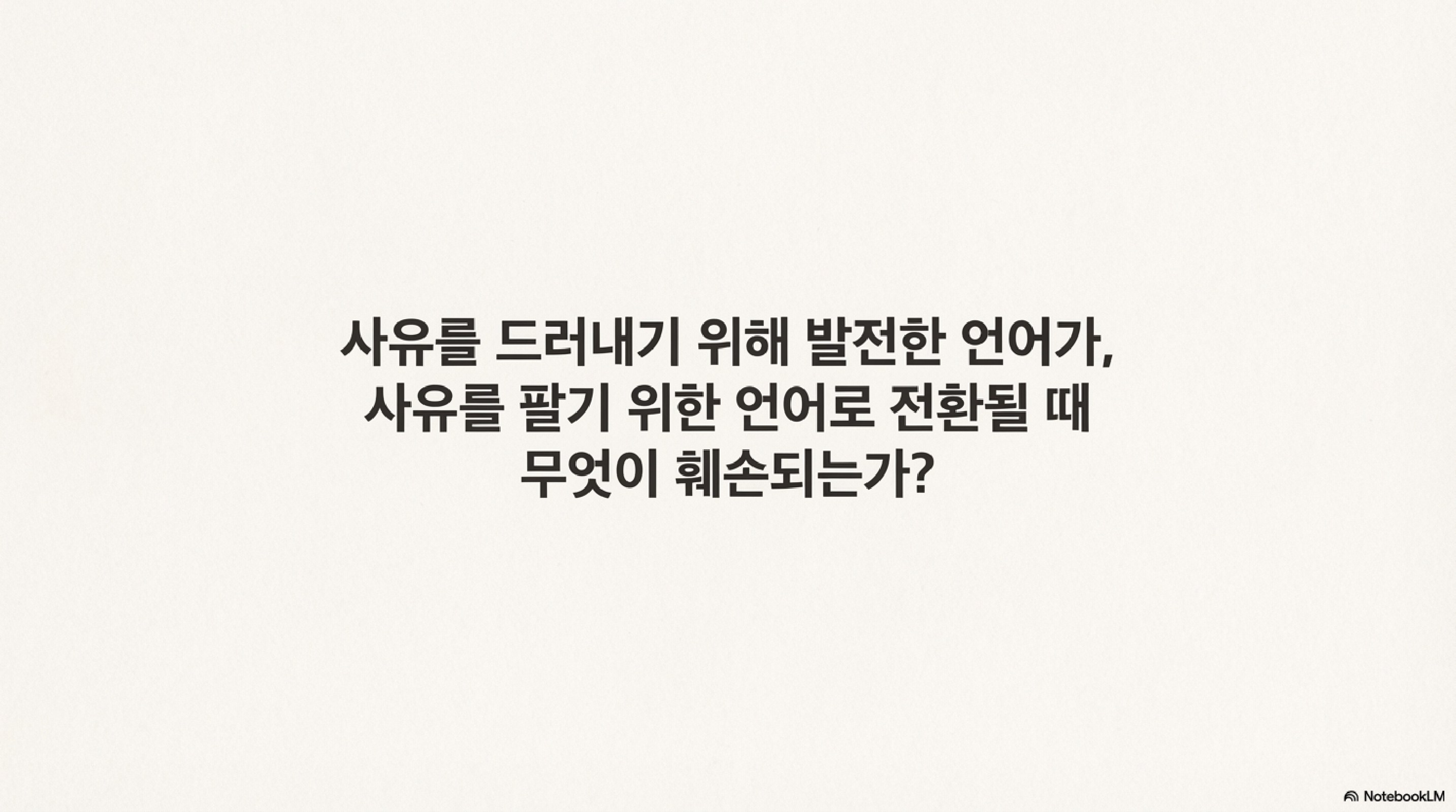 이러한 분석은 우리에게 중요한 통찰을 제공한다. "사유의 언어는 생산되는 것이 아니라, 유지되는 환경 속에서만 존재한다." AI의 역할은 사유를 창조하는 것이 아니라, 인간이 이미 만들어 놓은 사유의 환경을 반영하고 보조하는 거울과 같다. 우리 사회에 '망가진 언어'가 확산되는 것은 기술의 문제가 아니라, 속도와 효율, 즉각적인 결론을 강요하는 우리 문화의 문제다. 사유할 시간을 허락하지 않는 환경 속에서 사유의 언어는 필연적으로 오염될 수밖에 없다.
