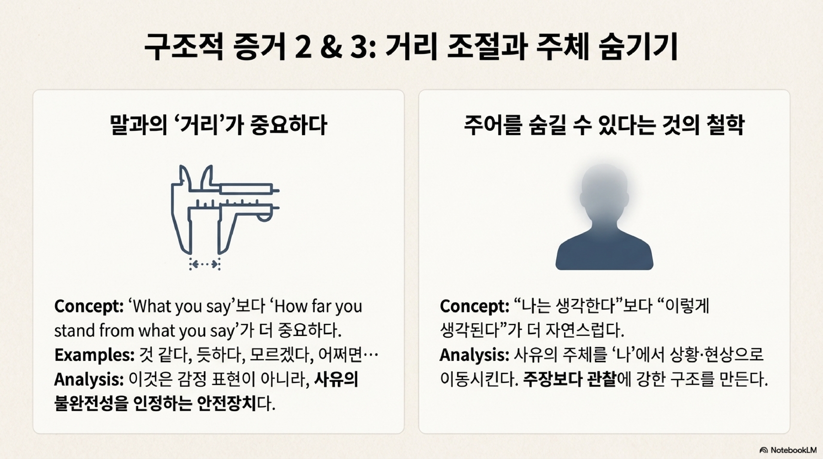 - '말하는 거리'를 조절하는 장치 한국어에는 "것 같다", "듯하다", "어쩌면", "아무래도"와 같이 말의 내용과 화자 사이의 거리를 조절하는 표현이 유난히 발달해 있다. 이것은 단순한 감정 표현이나 불확실성의 표시를 넘어선다. 이러한 장치들은 "나는 이렇게 생각하지만, 나의 생각이 절대적으로 옳다고 주장하지는 않겠다"는 사유의 태도를 문법적으로 구현하는 '사유의 안전장치' 역할을 한다. 이를 통해 화자는 자신의 생각을 드러내면서도 독단에 빠지지 않고, 독자에게 생각의 여지를 남긴다.