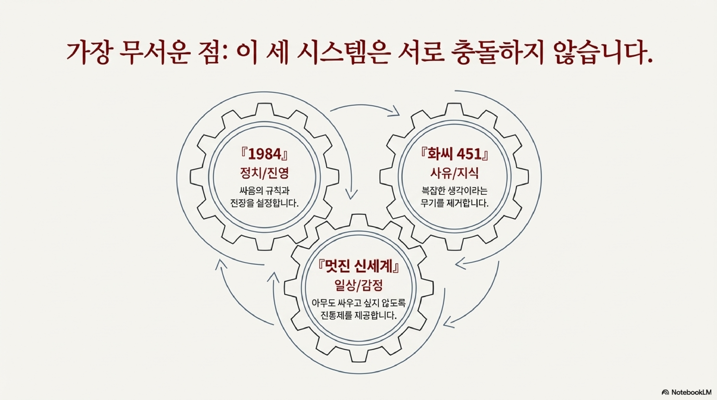 『1984』 없이 『멋진 신세계』와 『화씨 451』의 정밀 결합으로 사회적 압력을 통해 통제하는 ‘완성된 혼종’.