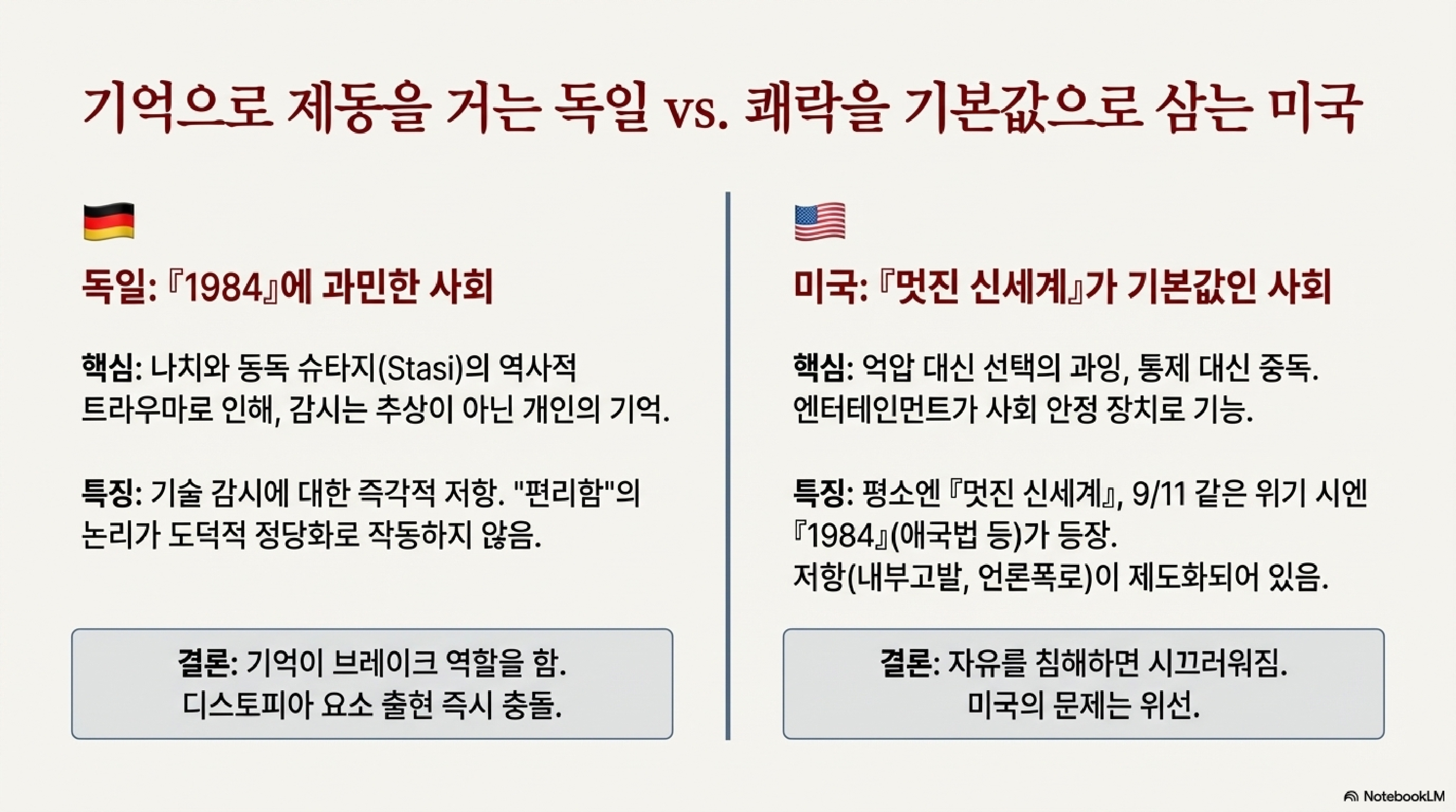 『멋진 신세계』가 기본값이지만, 위기 시 등장하는 『1984』에 대해 제도적 저항이 작동.
