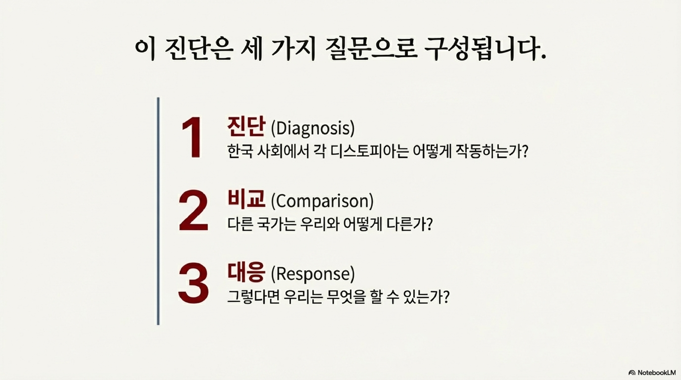 → 세 디스토피아가 분리된 영역에서, 느리게, 갈등하며 작동