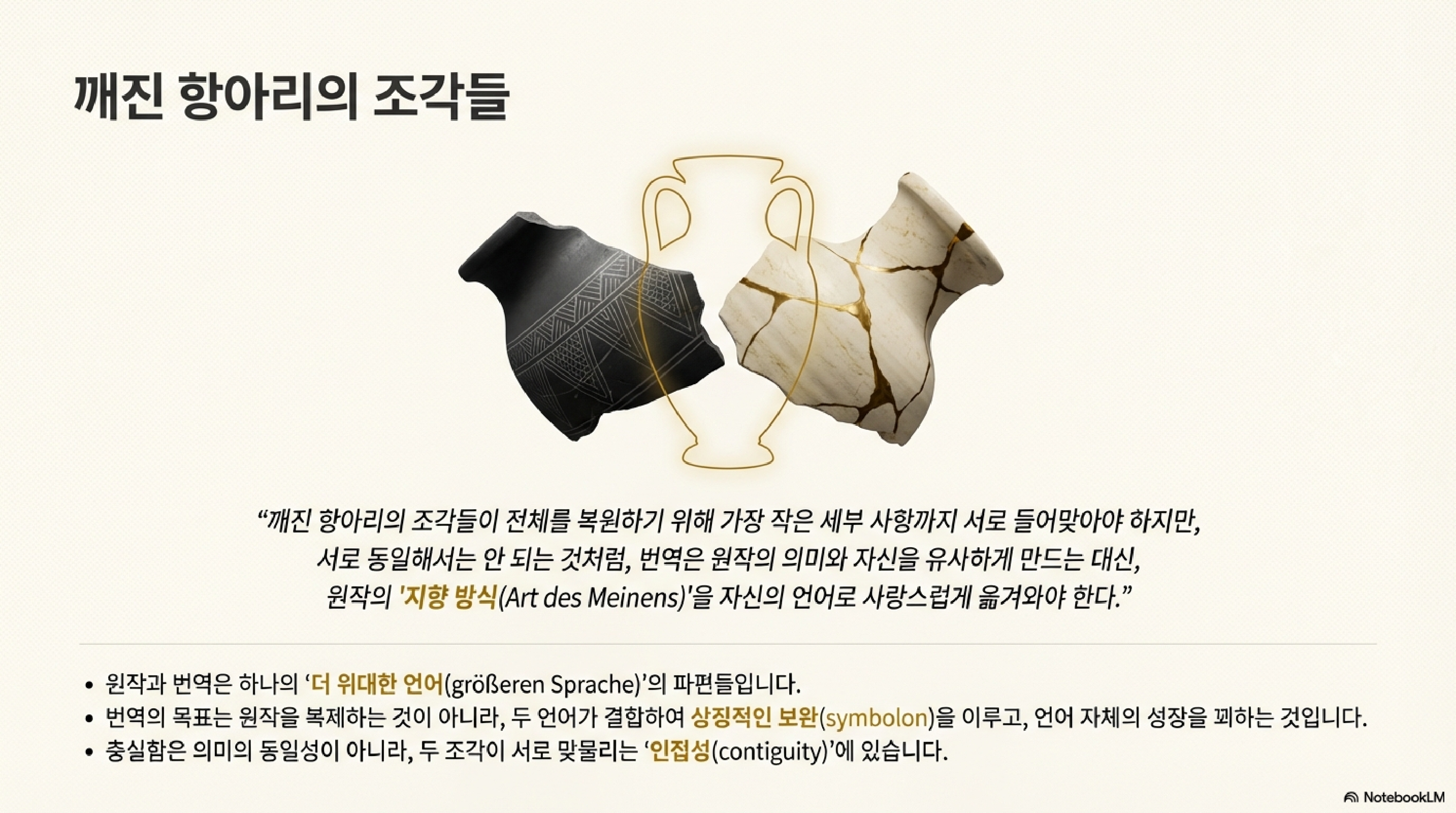 - 데리다의 항아리: 조각들은 "동일하지 않으면서도 세부적인 부분에서 인접해야" 합니다. 이 맞물림을 통해 언어 간의 '친족 관계'가 드러나고 '순수 언어'를 향한 동경이 표현됩니다.