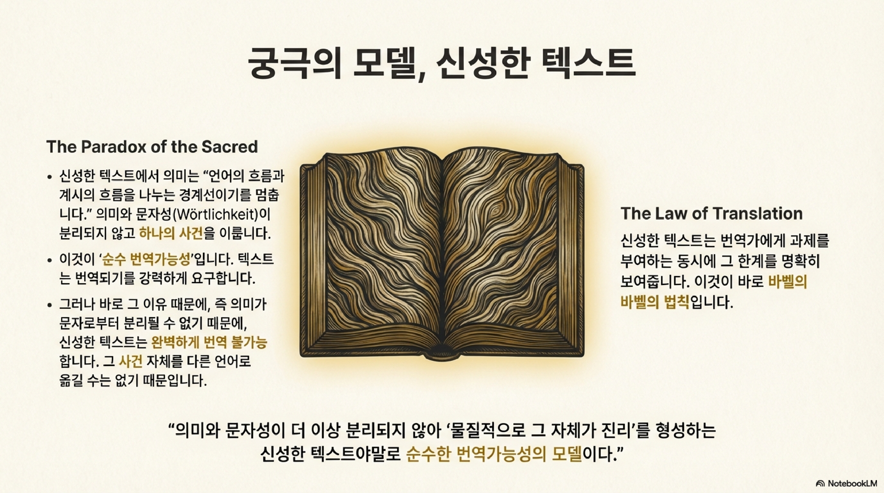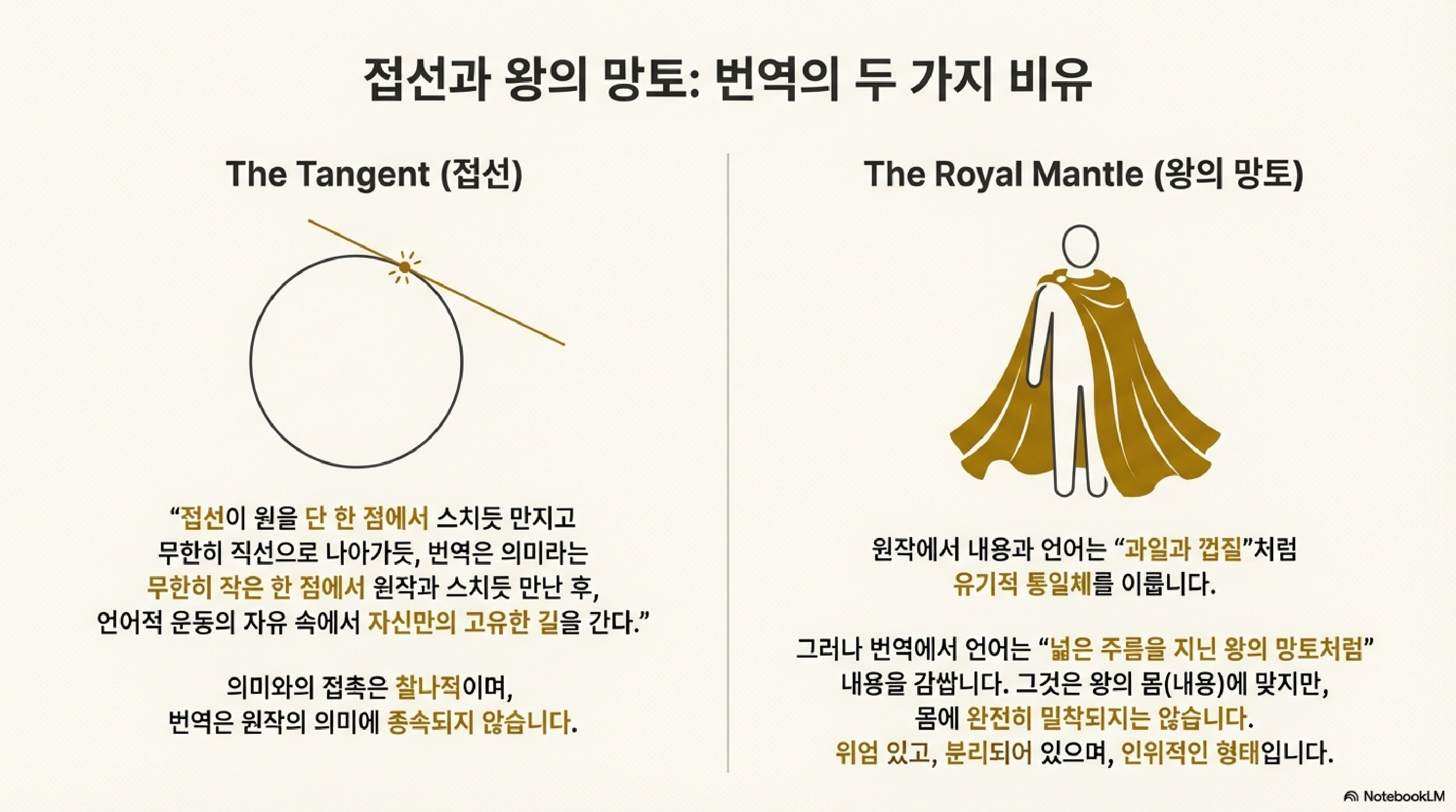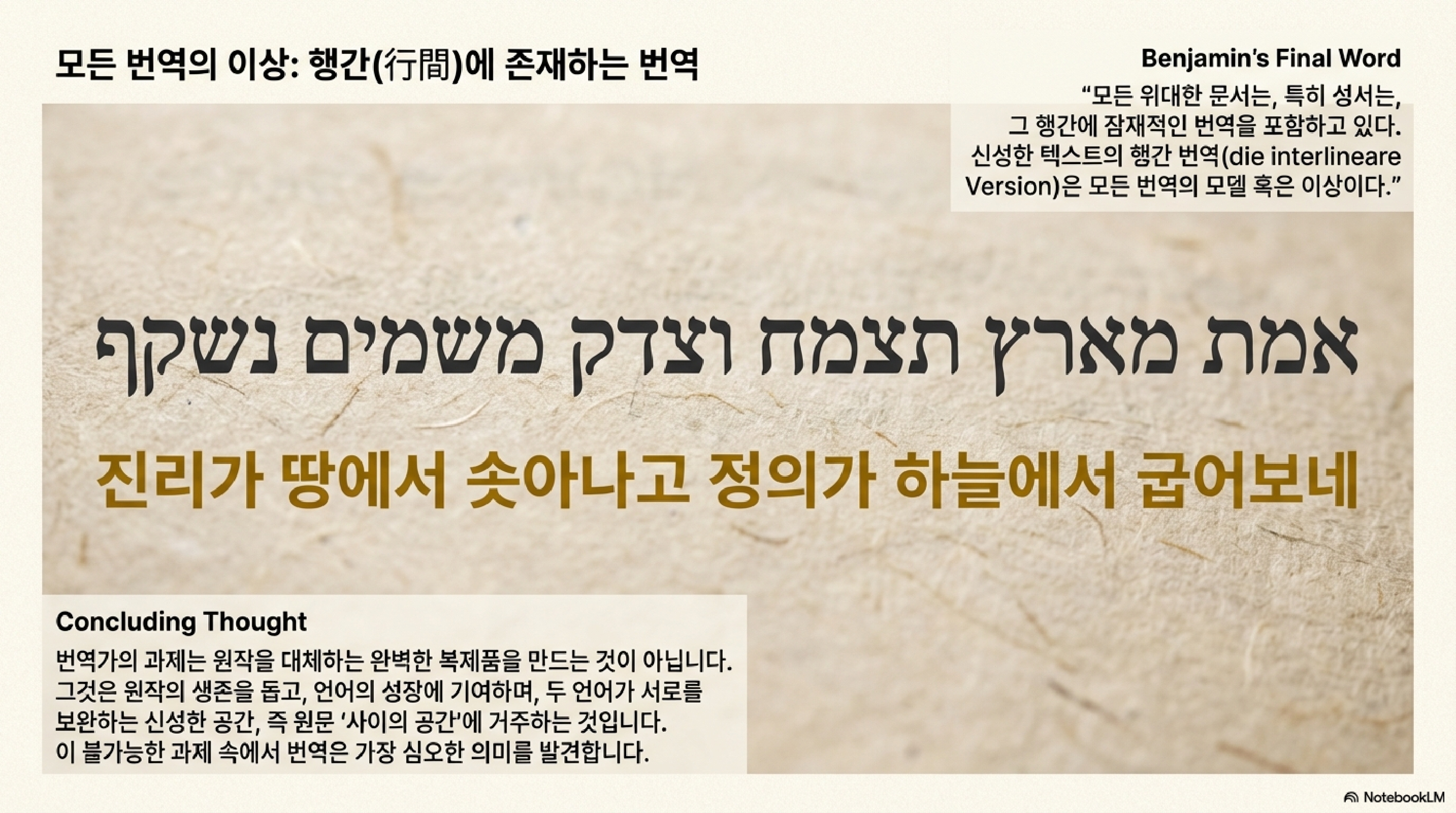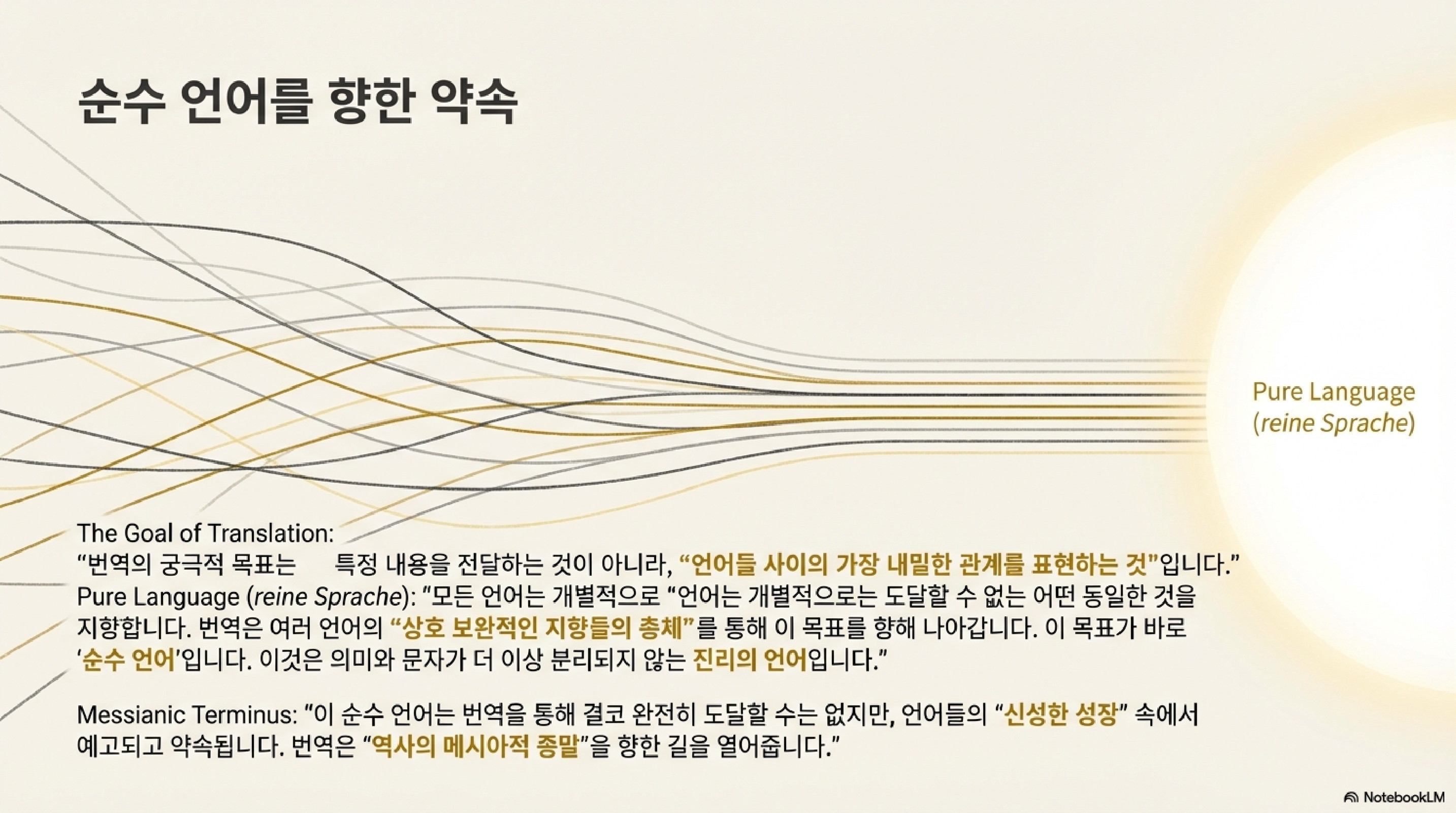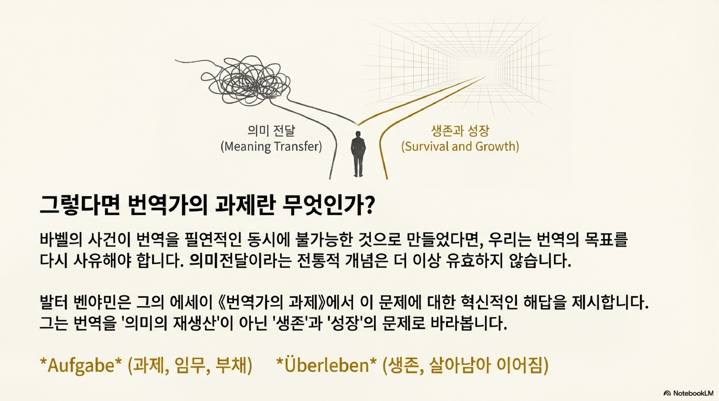 - 데리다의 관점: 원작은 번역을 요구하며, 번역을 통해 원작은 변화하고 갱신됩니다. 이는 역사 속에서 천천히 이루어지는 '성숙(maturation)'의 과정입니다.