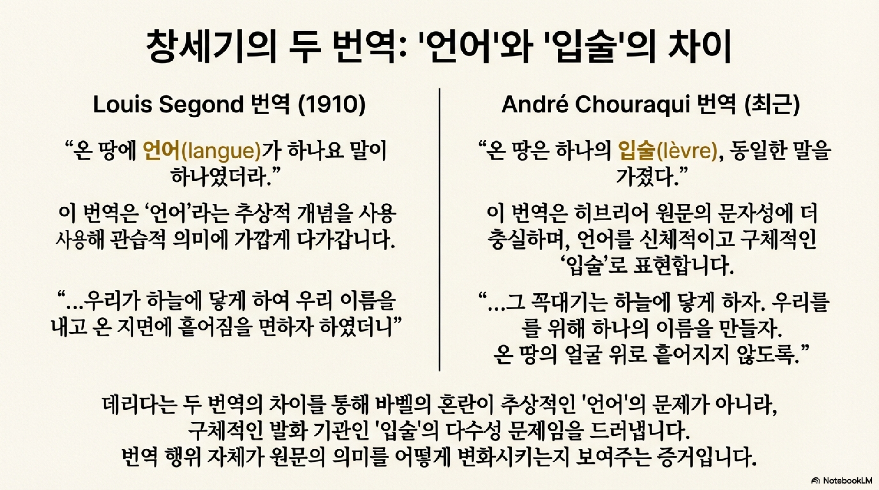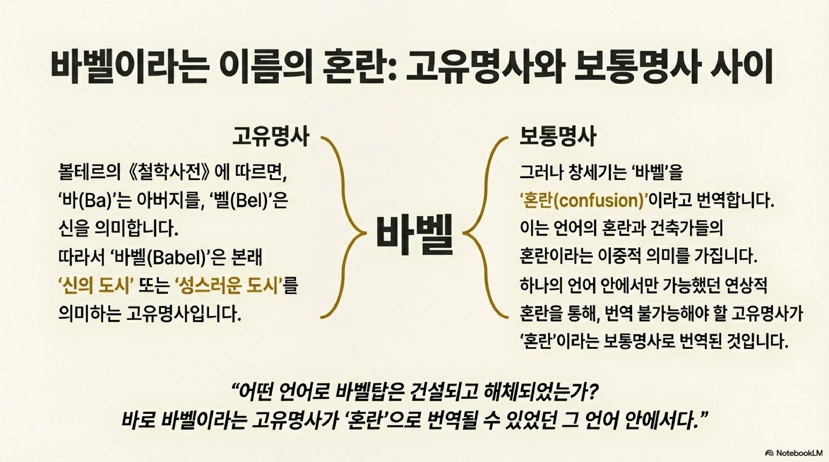 데리다는 '바벨탑' 이야기를 통해 인간이 단일한 언어(보편 언어)로 이름을 떨치고 흩어짐을 면하려 했으나, 신이 언어를 혼잡하게 만들어 이를 좌절시킨 사건을 분석합니다.