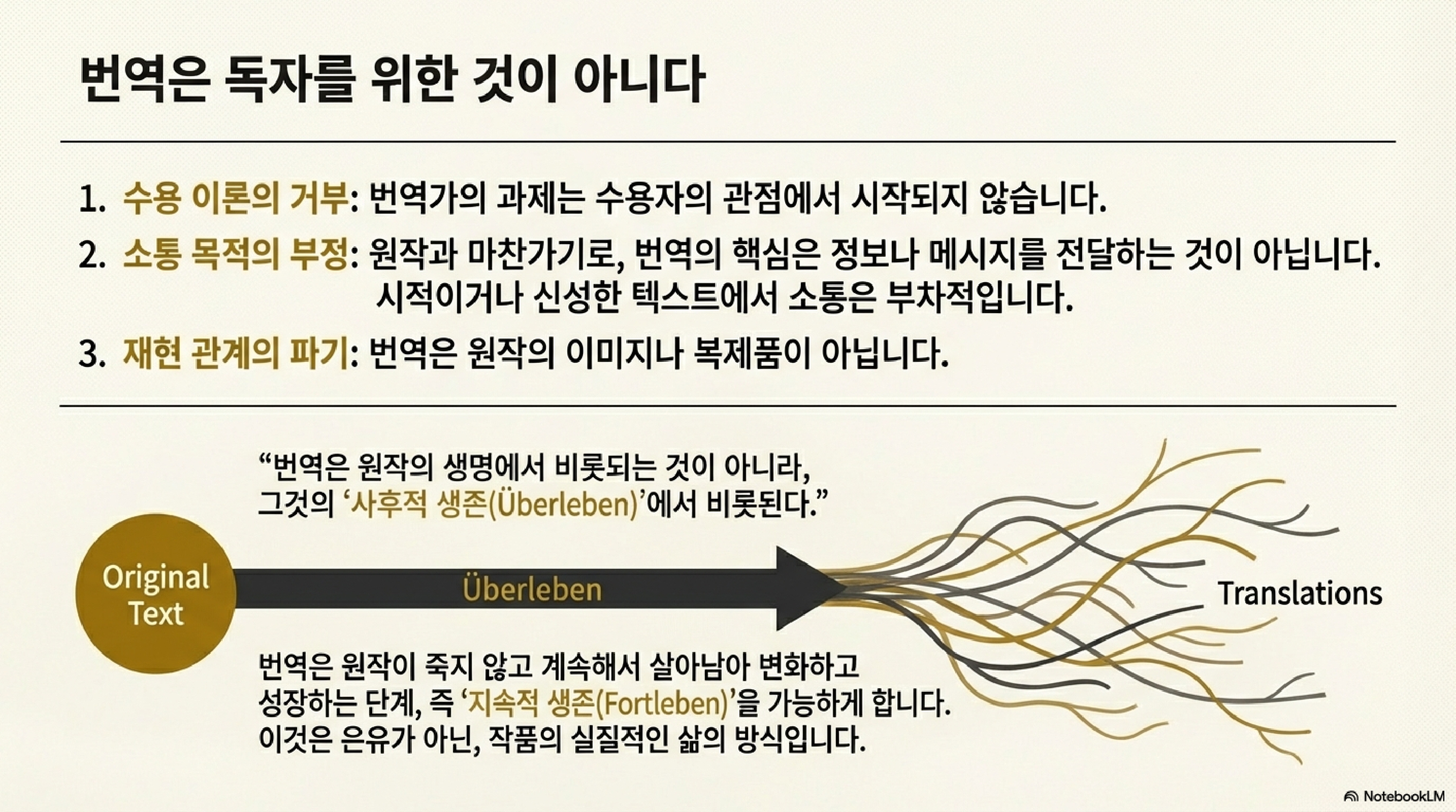 데리다와 벤야민에게 번역은 원작의 '생존(survie/Fortleben)'이었습니다. 번역은 원작이 죽지 않고 다른 언어 속에서 계속 성장하고 성숙해가는 시간적 과정이었습니다.
