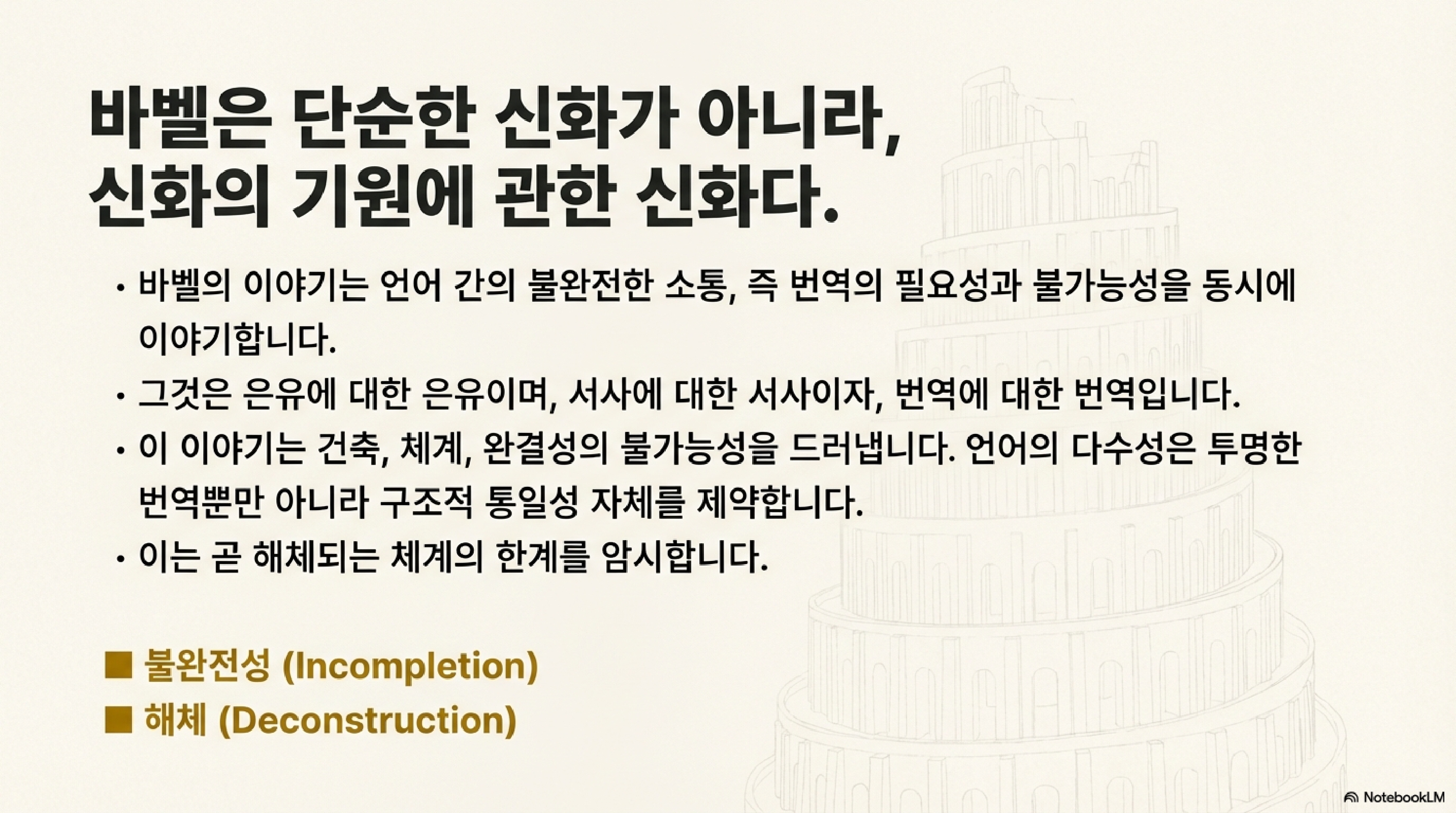 - 보편성과 혼돈: 인공지능은 방대한 문화적 지식을 흡수하여 마치 보편적인 지능처럼 보이지만, 이는 동시에 혼란(confusion)을 야기합니다. 데리다는 '바벨(Babel)'이라는 이름 자체가 '혼돈(confusion)'을 의미하며, 이는 번역의 불가능성과 구조적 완결의 불가능성을 내포한다고 지적합니다.