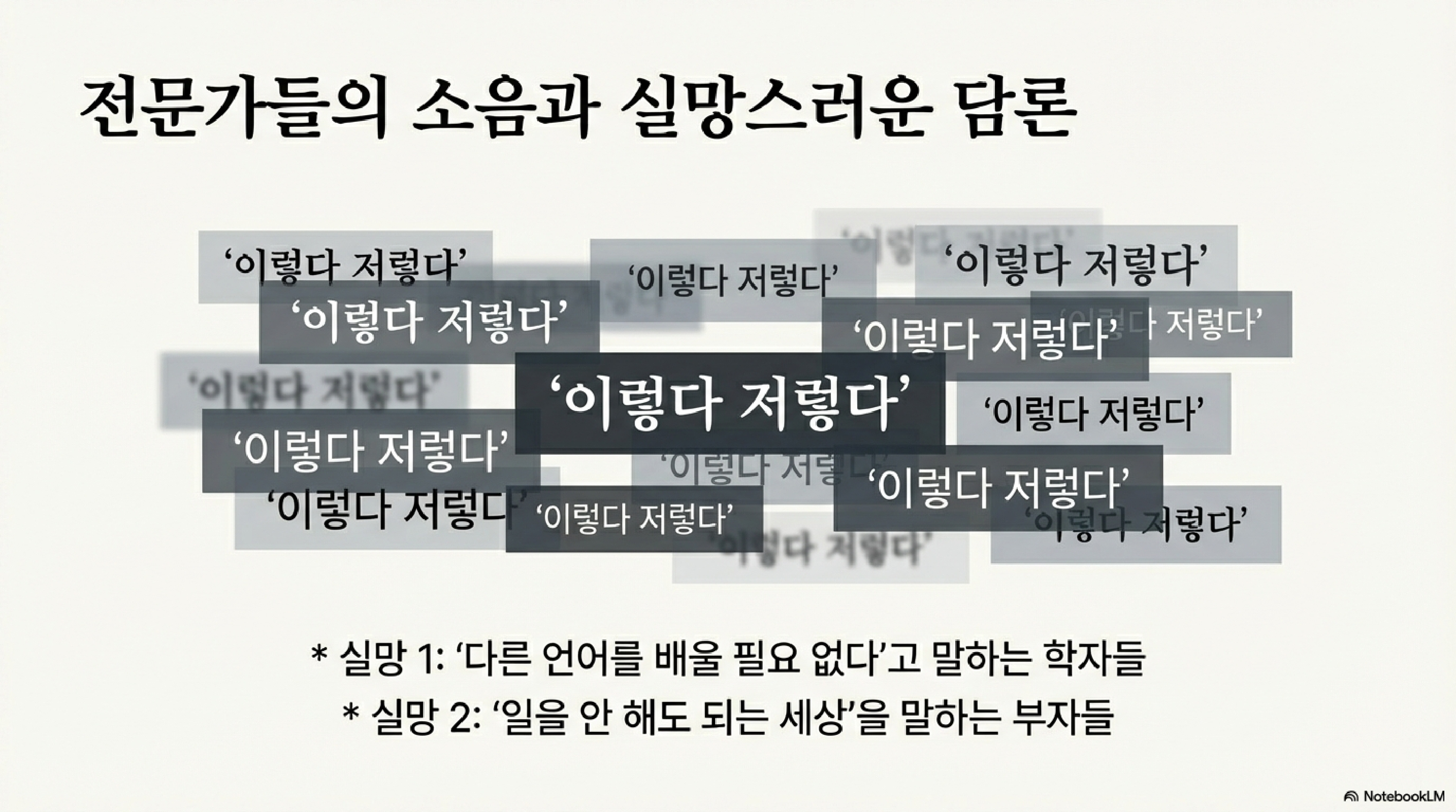 | AI 유행의 병폐 | 각종 전문가를 자처한 사람들의 이렇다 저렇다의 범람 | 각종 전문가를 자처한 사람들의 이래라 저래라의 범람 |