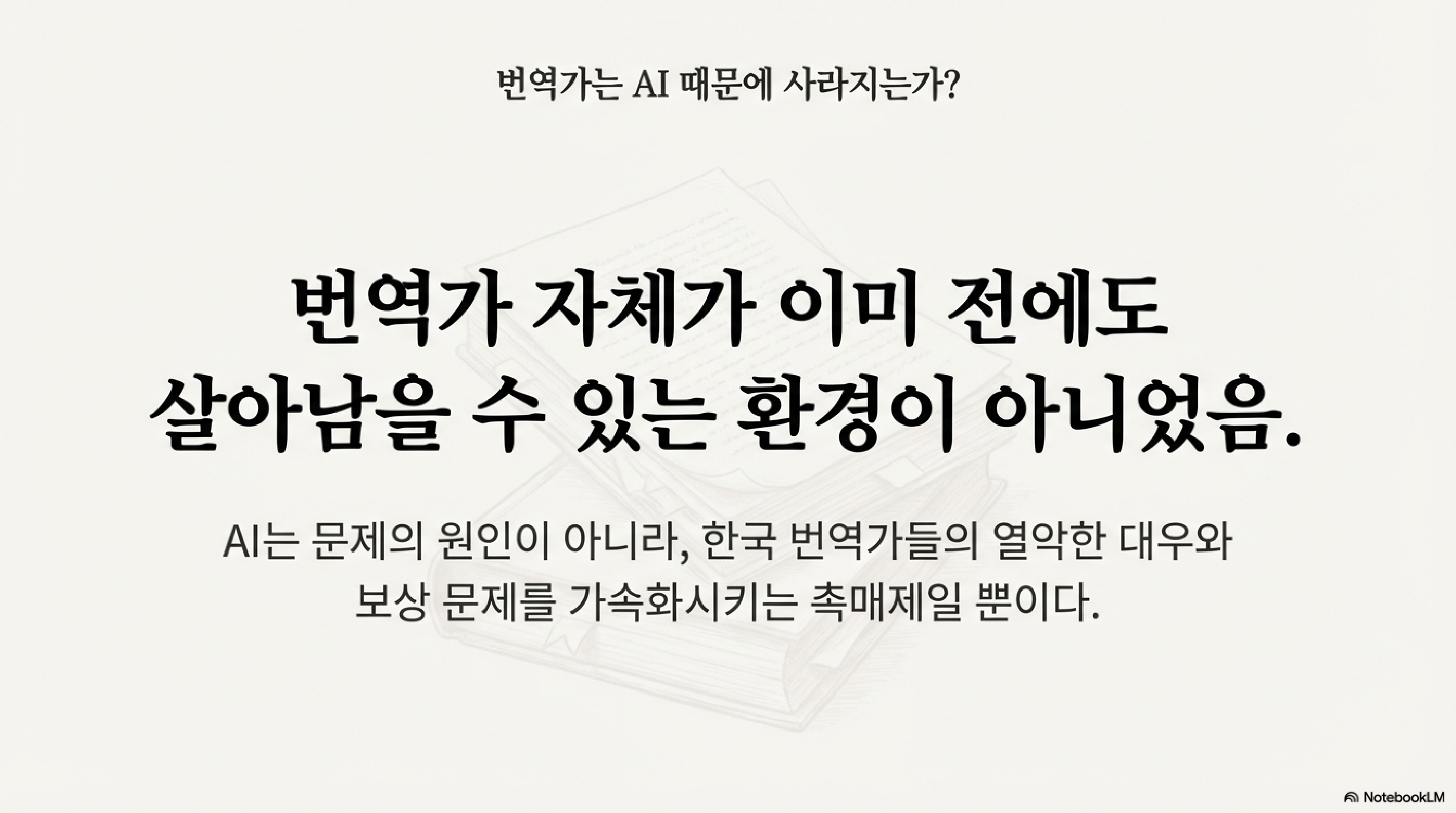 | 번역가의 존재감 (한국) | 이미 번역가 대우 형편없음. 번역가 자체가 이미 전에도 살아남을 수 있는 환경이 아니었음. | 이미 번역가 대우 형편없음, 번역가 자체가 이미 전에도 살아남을 수 있는 환경이 아니었음. |