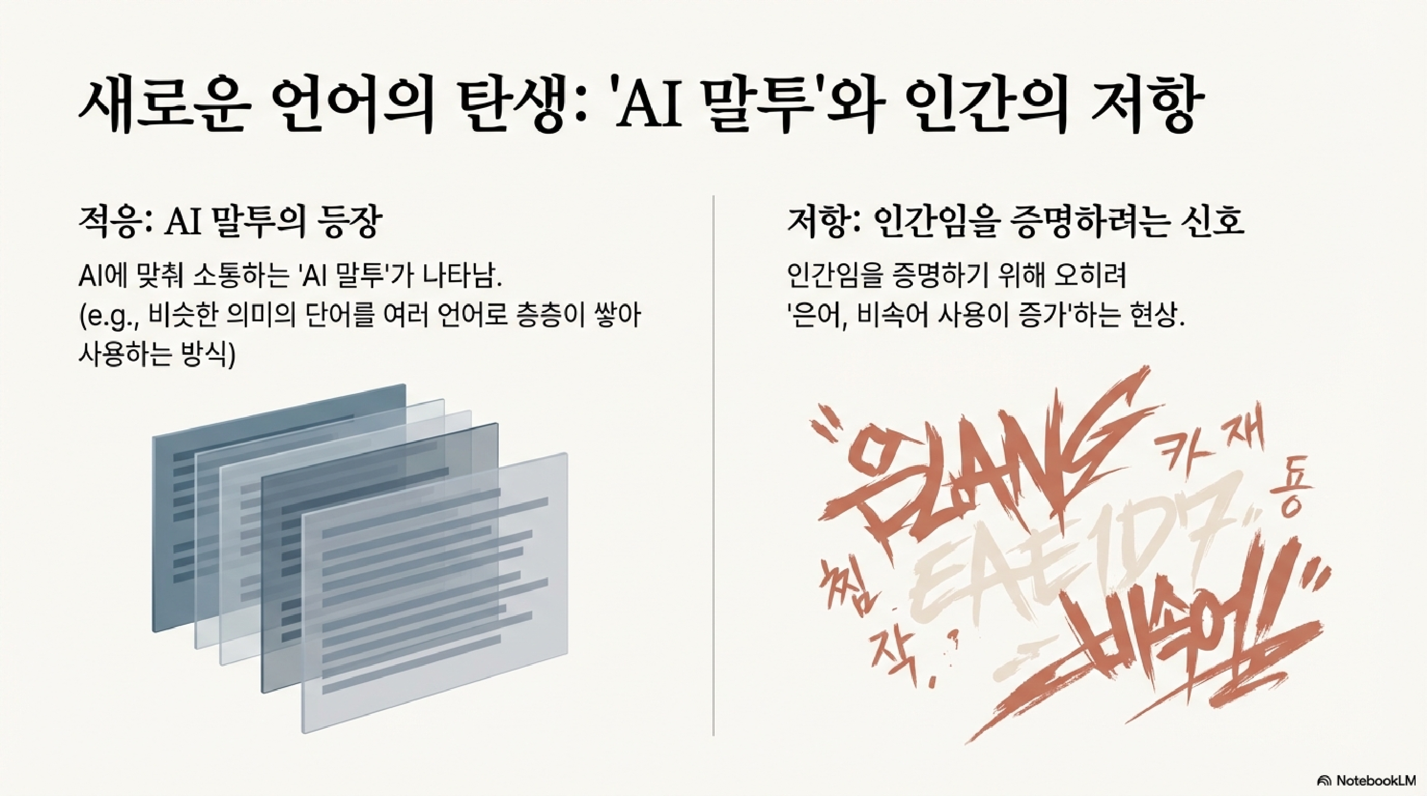 | AI 번역 효과의 다른 면 | 은어, 비속어 사용 증가 | 폐쇄 집단의 우월감, 대중문화로 흘러들어 키치화 |