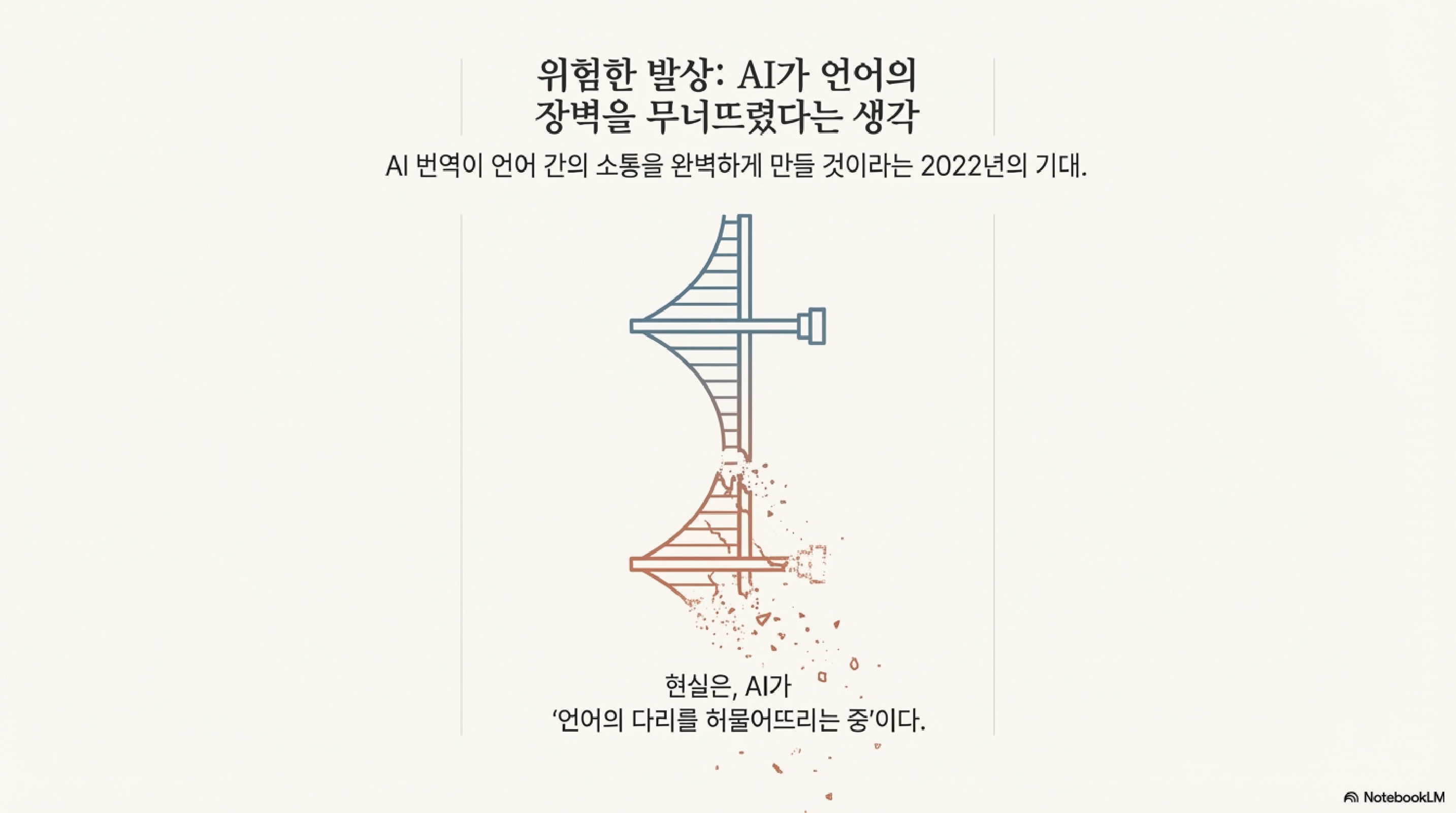 | 위험한 발상 | AI가 인간을 따라잡을 수 없다는 발상 | AI로 언어의 장벽이 무너졌다는 발상 |