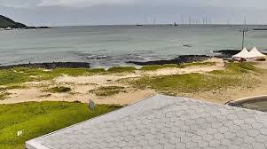 - 투명한 에메랄드빛 바다 + 백사장 실시간으로 보여줘요. 겨울이라 사람 거의 없고 파도 소리만 들릴 거예요.