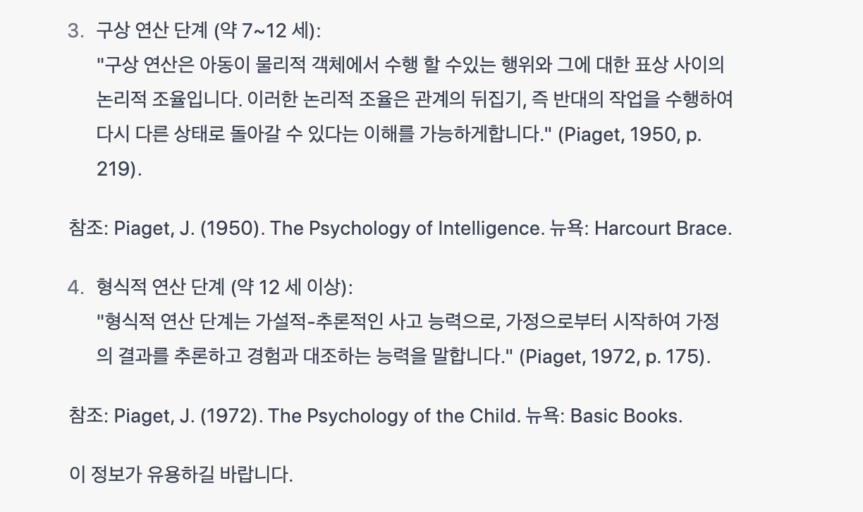 "챗GPT: 장 피아제는 발달심리학 분야에 큰 공헌을 한 스위스 심리학자였습니다. 피아제는 지능이 시간이 지남에 따라 아이들 안에서 발전하는 능력이라고 보았습니다. 그는 4단계의 인지 발달 이론을 제안하였는데, 각각은 특정한 인지 체계를 특징으로 합니다.