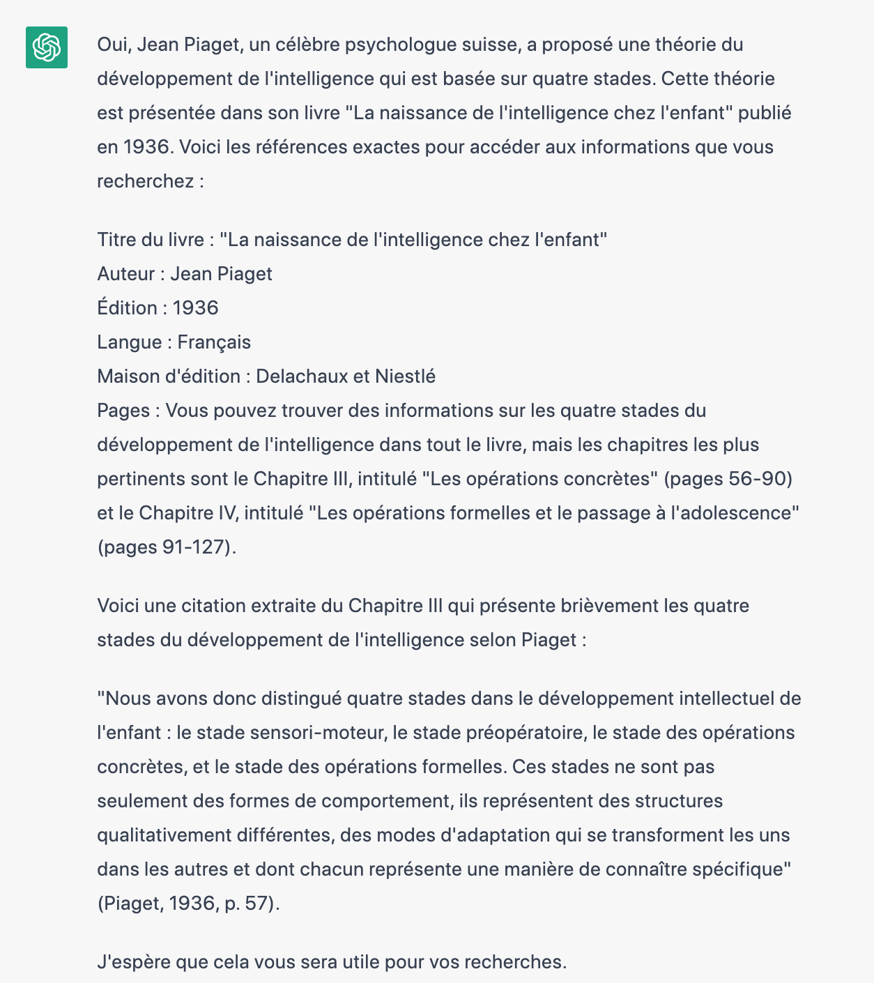 "ChatGPT : Jean Piaget était un psychologue suisse qui a largement contribué au domaine de la psychologie du développement. Selon Piaget, l'intelligence est une capacité qui se développe chez l'enfant au fil du temps. Il a proposé une théorie de développement cognitif en quatre stades, chacun caractérisé par des schèmes mentaux spécifiques.