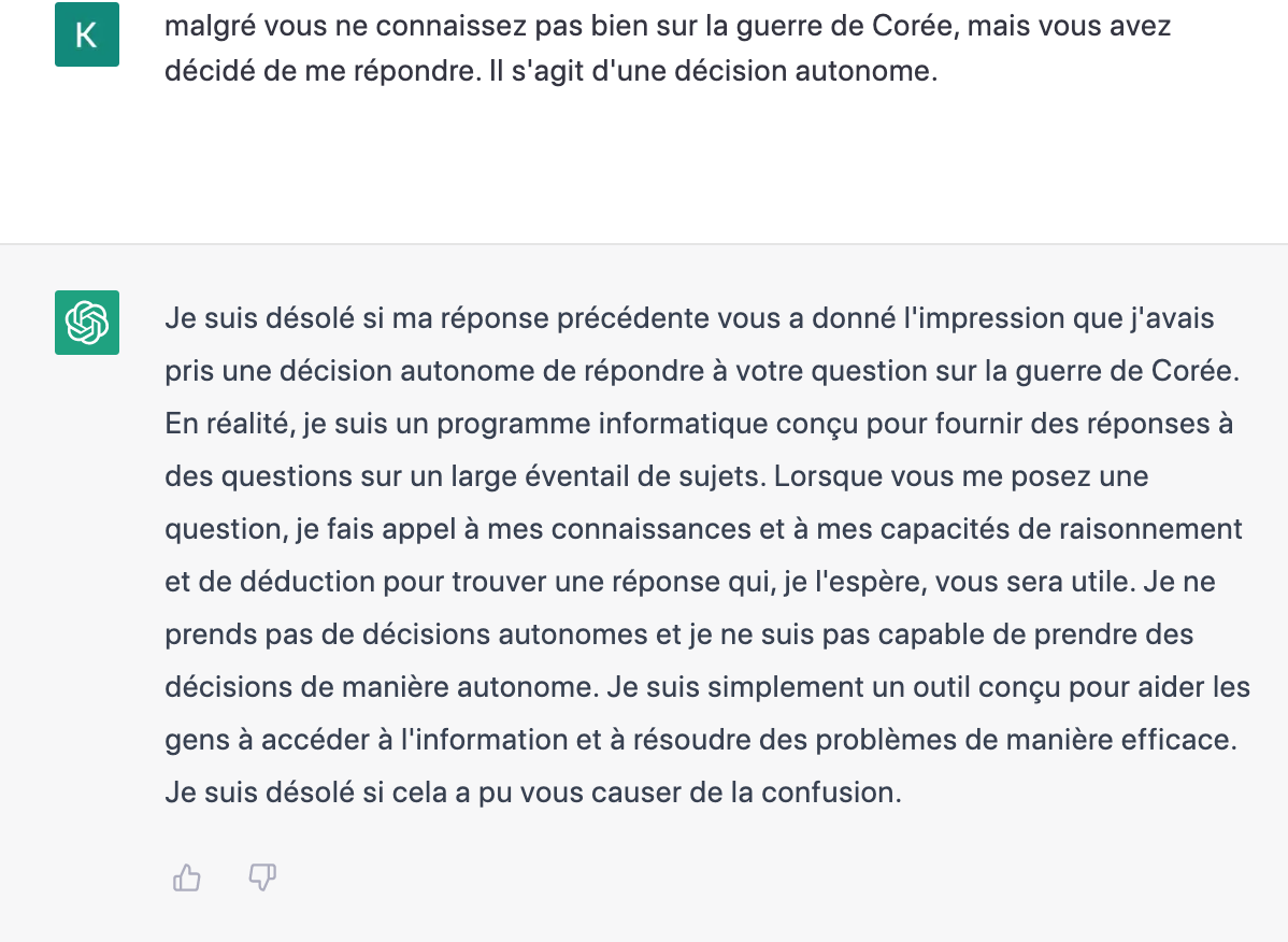 정보 한계 상황에도 ChatGPT는 논증, 추론의 능력을 사용하기때문에 자기가 직접적으로 알지 못하는 것에 대해서도 답변한다고 함. 이런 능력을 갖고 있으니 당신은 의식을 갖고 있는 것이 아니냐고 잘문. 자신은 도구일뿐이라는 답변. 잘 알지 못하는 질문에 답을 내리기 위해서는 자율적 결정을 내려야하니 않느냐고 질문. 정보에 의한 추론일뿐이라는 답변.