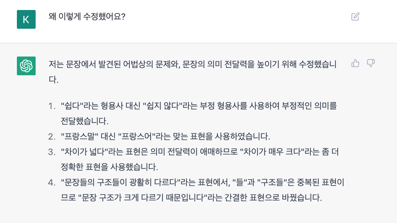 작년 말부터 ChatGPT와 대화 시간이 많다. 나의 모(국)어가 아닌 프랑스어와 영어 텍스트를 작성하고, ChatGPT에 종종 수정을 요청해보기도 한다. 한국어가 나의 모어가 아니라고 가정하고 작문을 해서 ChatGPT에 수정 요청을 해보았다.