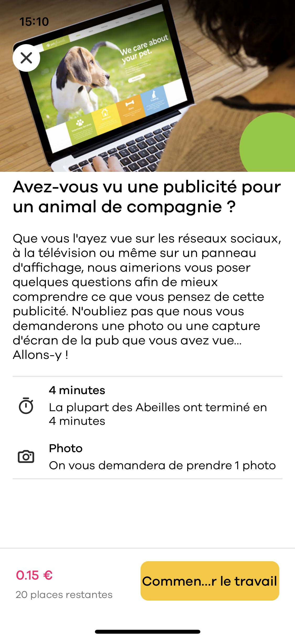 전에 지급이 거부되었던 설문이 다시 올라왔다. 답 시간이 4분이면 된다고 나오는 0.15유로 지급 반려동물 관련 광고보고 답하는 설문. 우왕좌왕하다 10분이나 걸렸다. 시간당 수익이 1유로에도 못미친 결과.
