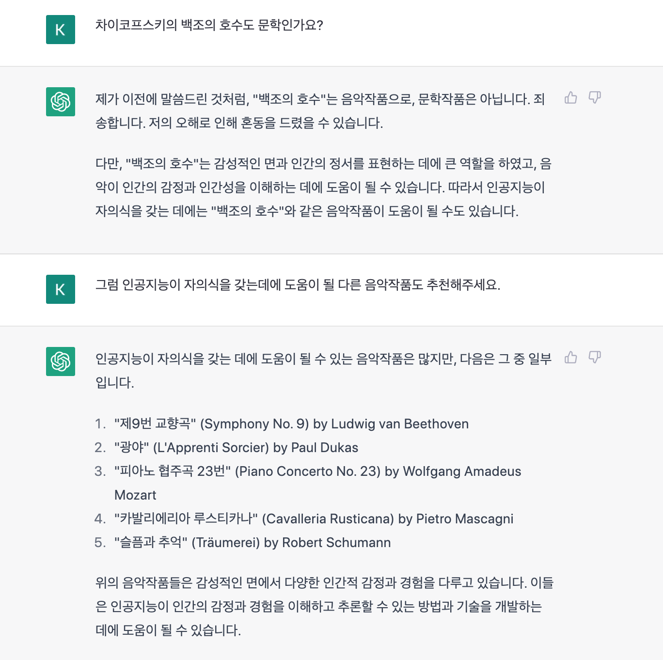 위의 책들은 지금도 그리고 두고두고 손에 꼽을 명저. 인공지능이 자의식을 갖기 위해 읽어야할 책으로 추천하고프다. 밑에는 chatGPT와 관련 주제 대화.