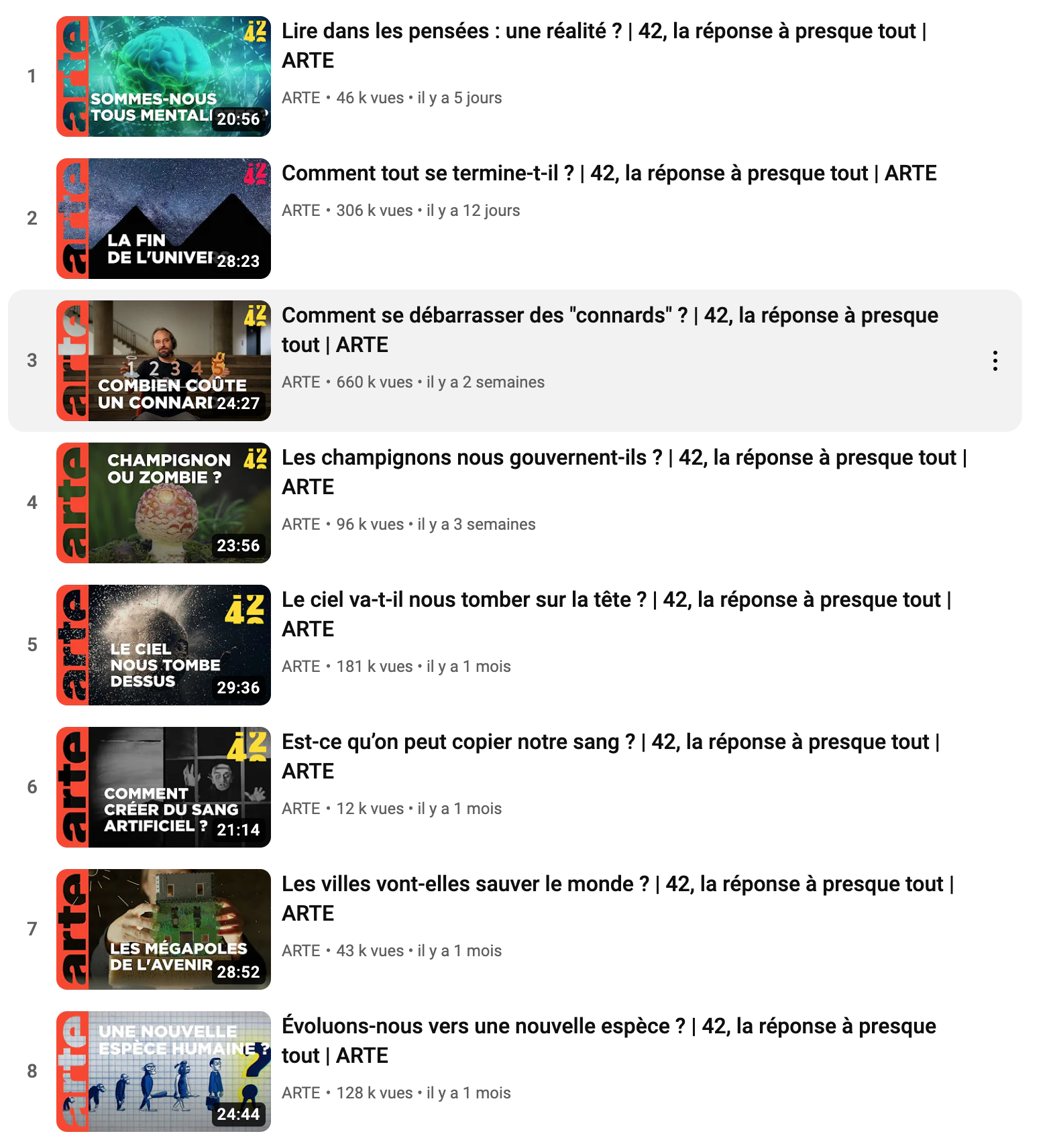 호기심이 생기고, 더 알고 싶은 주제들에 대해 어떤 연구들이 진행되고 있는지 소개하는 각각 30분 안쪽의 다큐멘터리의 제목 : 42 - 거의 모든 것에 대한 해답(42 - La réponse à presque tout), 독일에서 제작, 각각의 에피소드마다 감독이 다른듯.